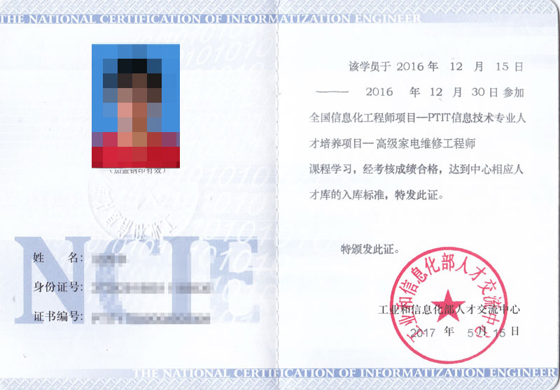 可考取全国通用的中华人民共和国信息产业部硬件维修工程师高级职业资格证书,证书全国通用,证书编码全国唯一,可通过信息产业部官网查询。