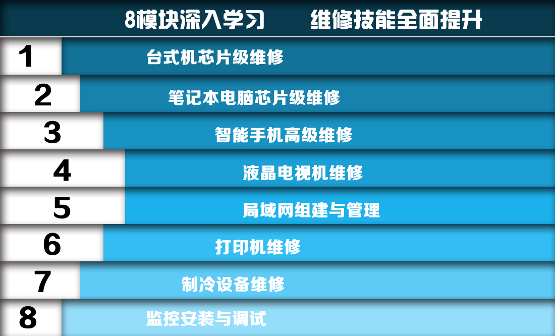本课程主要面向有意将来从事维修工作的学员学习,年龄不限、有无电脑维修基础者不限。学习完成后可独立从事电脑台式机及笔记本软、硬件、高端智能手机维修、液晶电视机维修、打印机维修、安防监控安装与调试、局域网组建与管理、空调、冰箱维修等、其它家用电器维修的各类故障维修,达到独立开设电脑维修店的标准,可熟练精修各类硬件维修故障,处理各类芯片级疑难问题等。可在电脑售后维修服务、各类电脑维修公司及网络组建与管理等方面工作,尽可能实现了维修一步到位。 同时也精学到网络管理热门门学科。
